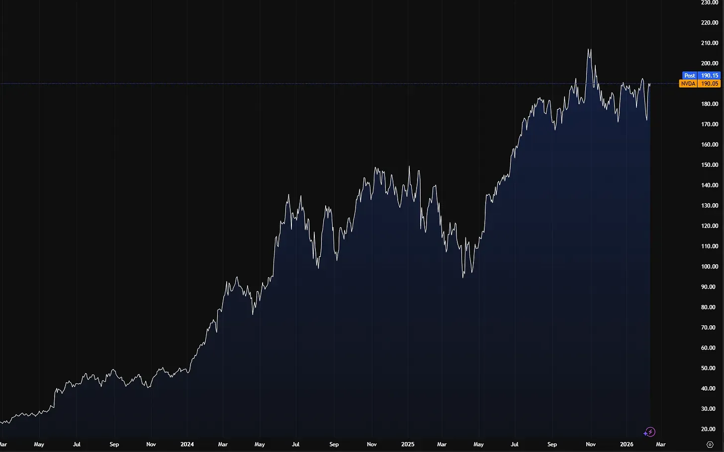 Nvidia: da circa 15 dollari a inizio 2023 (pre-split) a circa 190 dollari oggi, dopo aver toccato un picco di 207 dollari nell’ottobre 2025. Parliamo di un +1.200–1.300% dai minimi di tre anni fa.