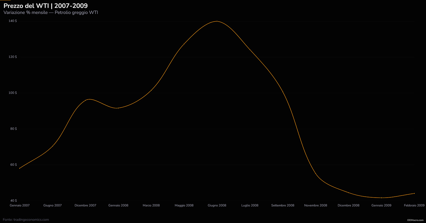 Esiste infatti un secondo scenario, meno ovvio ma storicamente molto più robusto. Uno scenario in cui uno spike verticale del greggio non alimenta l’inflazione, ma la soffoca — insieme all’economia che dovrebbe trascinarla. Per capire dove siamo diretti nel 2026, bisogna tornare al 2008. Non per nostalgia, ma perché quel ciclo resta il manuale operativo più preciso che abbiamo.