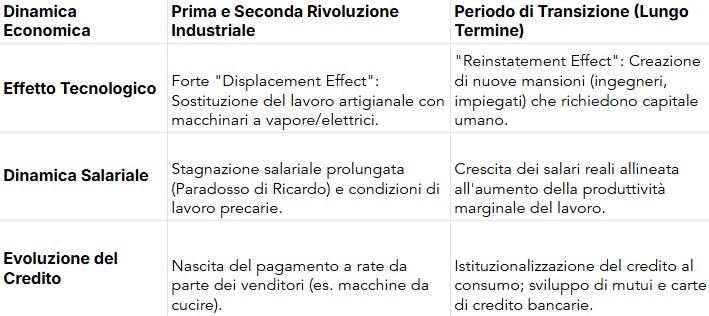 Nelle passate rivoluzioni industriali, l’automazione (come la macchina a vapore) distruggeva vecchi mestieri ma ne creava di nuovi e più produttivi (l’effetto di “reinserimento”). Questo permetteva ai salari di crescere e alle banche di prestare denaro con fiducia.