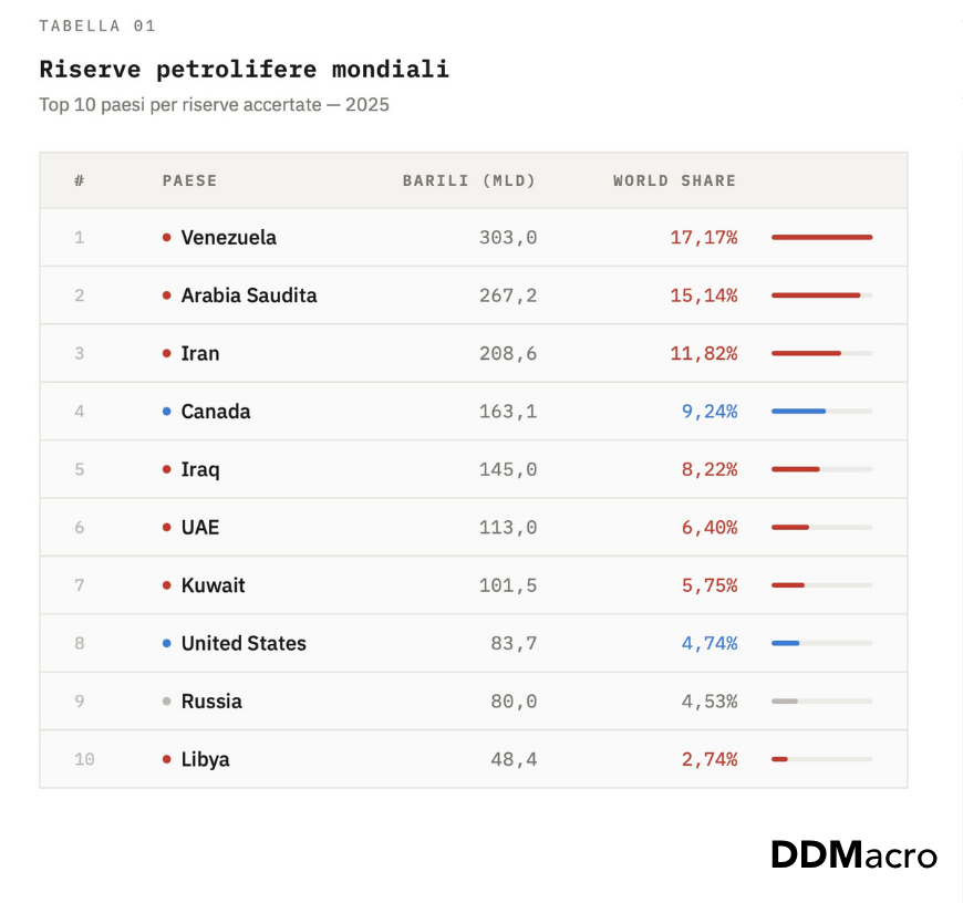 I principali competitor indipendenti di chi possiede le riserve — Iran, Venezuela, Iraq — sono esattamente i paesi che gli Stati Uniti hanno sistematicamente indebolito, sanzionato o portato nella propria orbita. Il Venezuela, con le riserve più grandi del mondo, è stato preso sotto influenza americana a gennaio 2025. L’Iran, terza riserva mondiale, è il bersaglio dichiarato dell’escalation corrente. L’Iraq rimane largamente dipendente dall’ombrello americano.